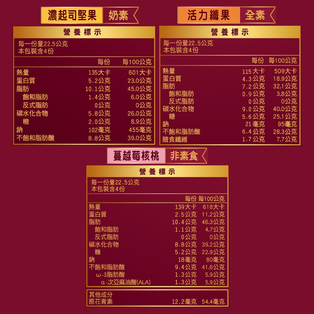 ✔蔓越莓核桃:萬歲牌以特殊淋漿製程,將爽脆核桃裹上Q甜蔓越莓果乾,口口享受雙重美味,核桃的Omega-3與果乾的花青素,提供營養補給,散發自然光采!
