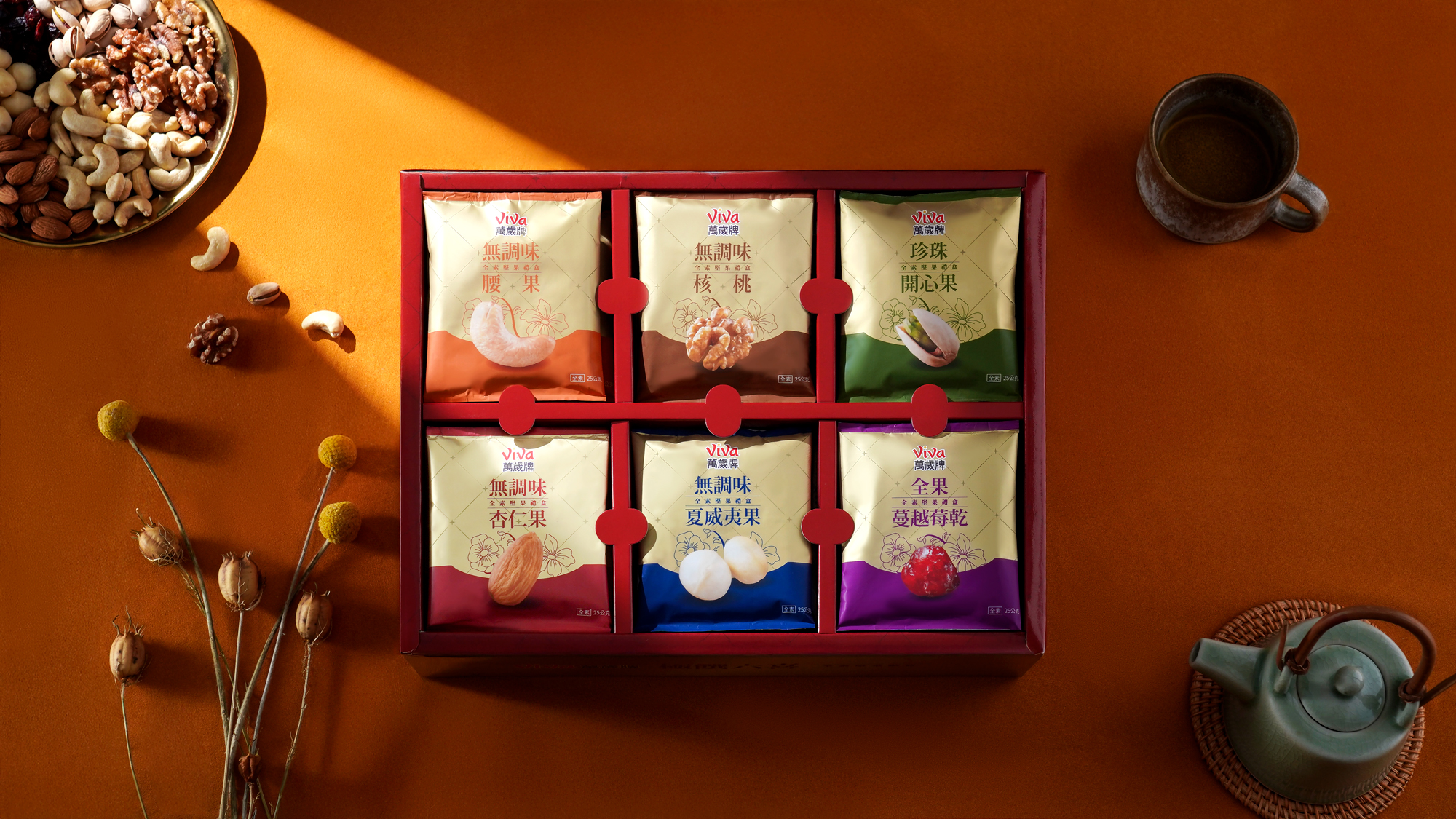 嚴選萬歲牌六款經典堅果果乾,組成的全素食禮盒。