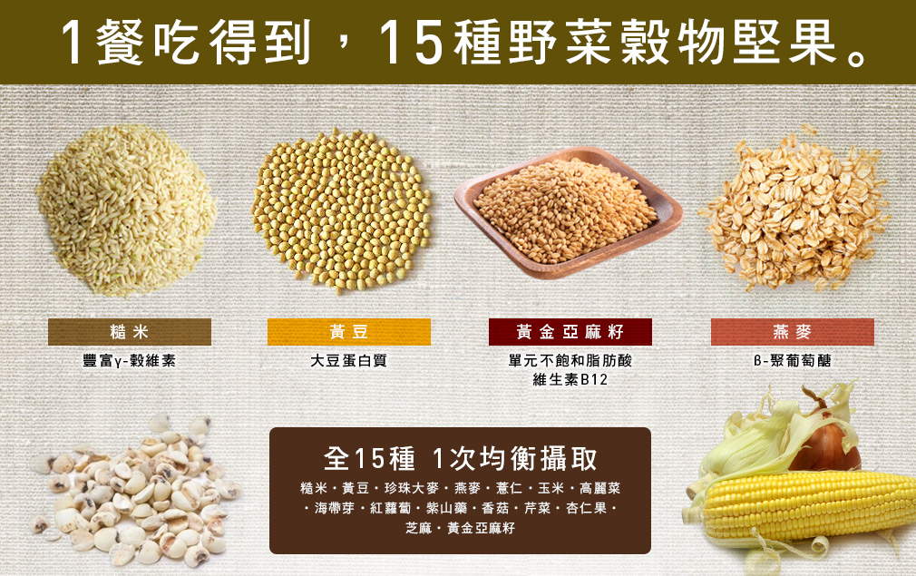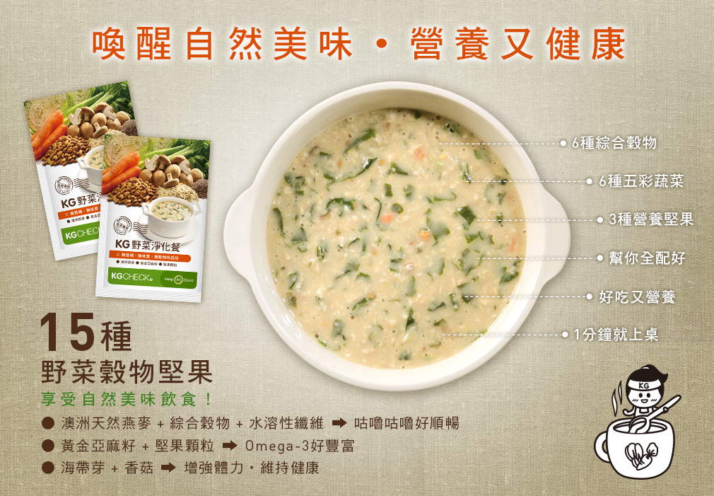 ➤融合澳洲燕麥、綜合穀物、食物纖維、黃金亞麻籽、堅果顆粒、海帶芽、香菇等食材