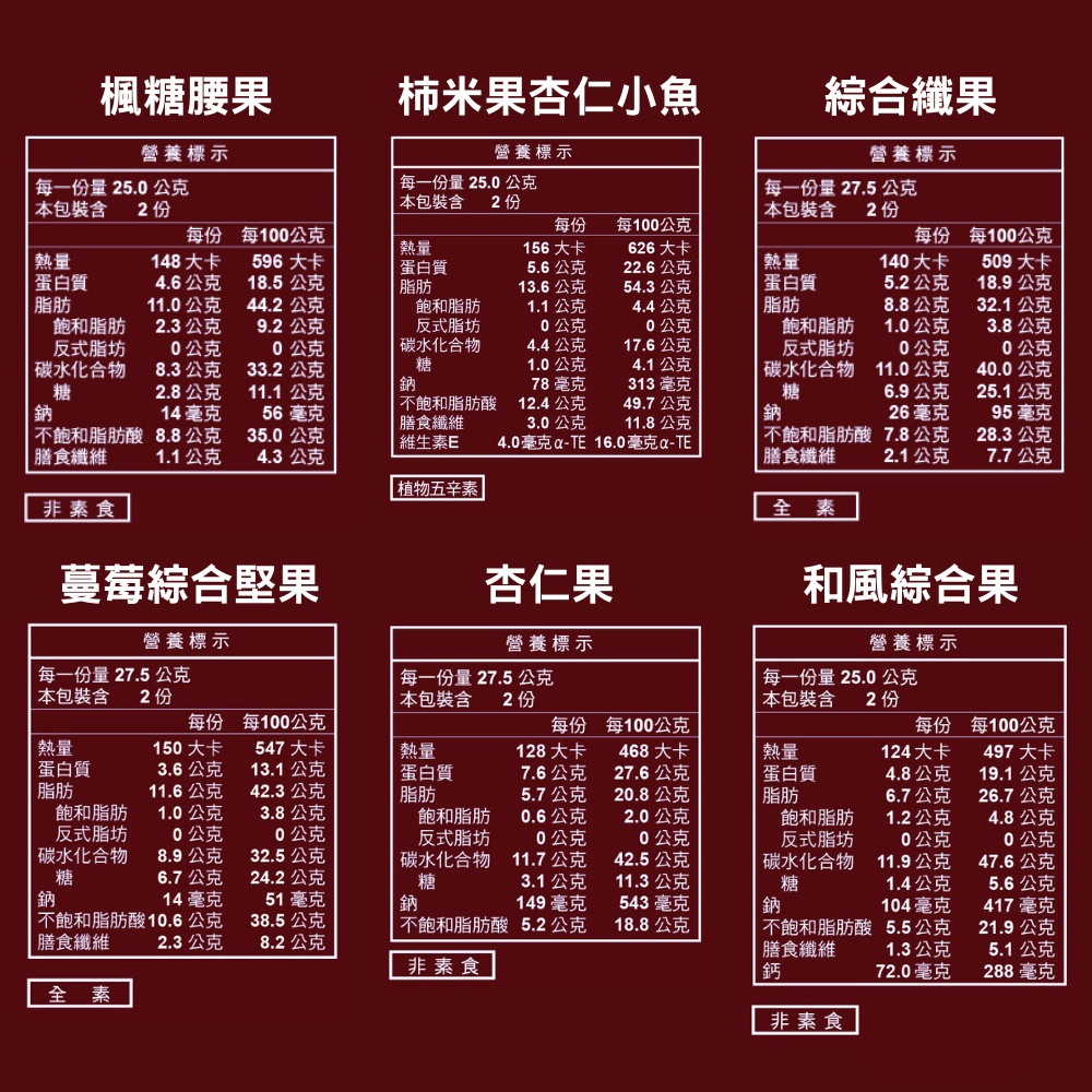 蔓莓纖果/楓糖腰果/杏仁果/綜合纖果/和風綜合果/柿米果杏仁小魚