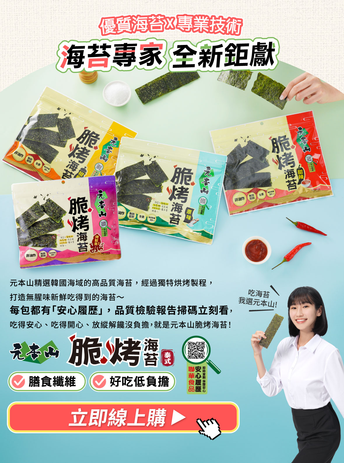元本山-脆烤海苔椒鹽風味(34g/袋),★非油炸爽脆解饞★,U32080002,元本山-脆烤海苔椒鹽風味(34g/袋),有效期限,全素