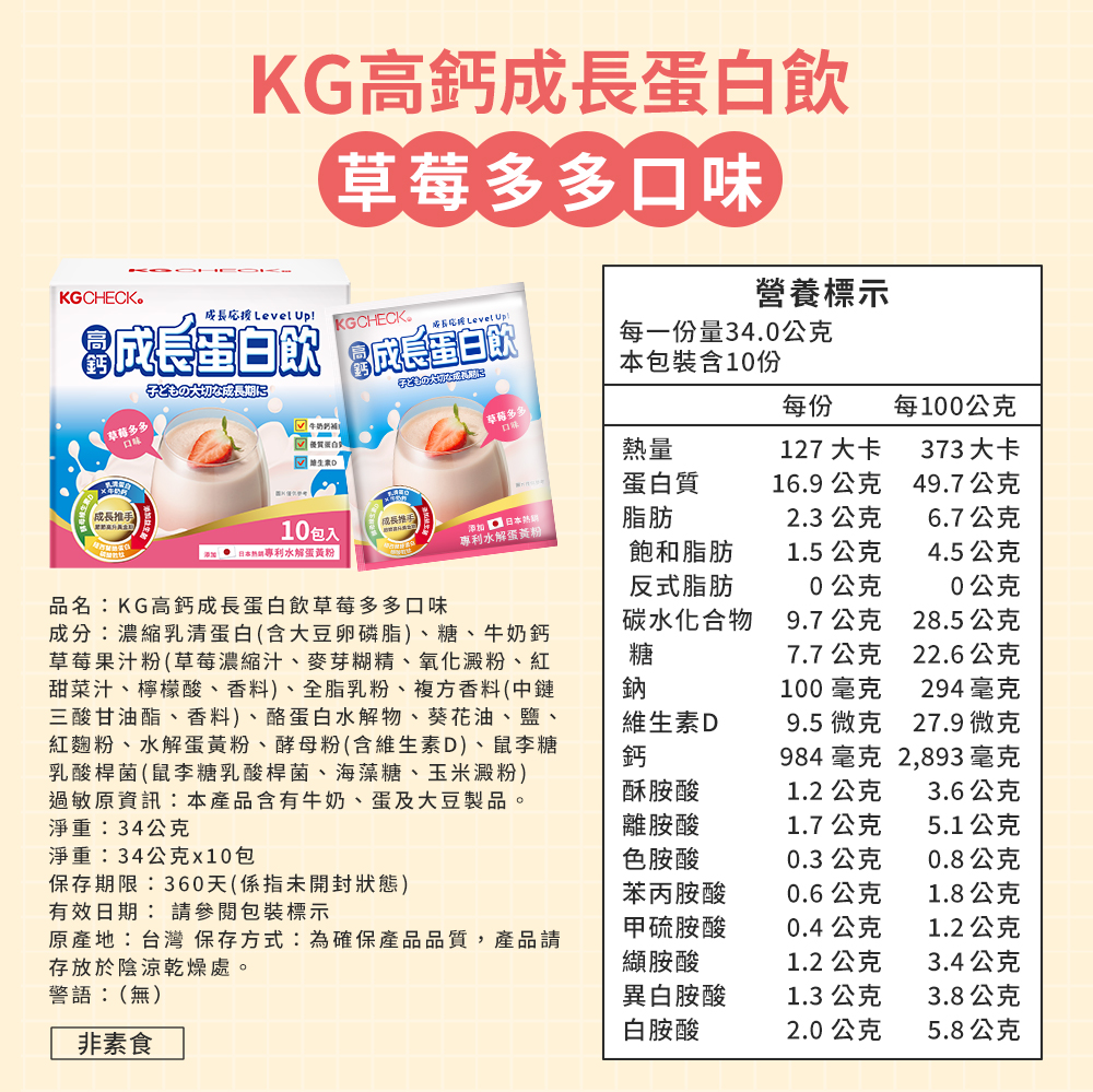 高鈣成長蛋白飲-草莓多多口味(10包),★相當於9杯牛奶營養★,U32680001,高鈣成長蛋白飲-草莓多多口味(10包),非素食,黃金成長