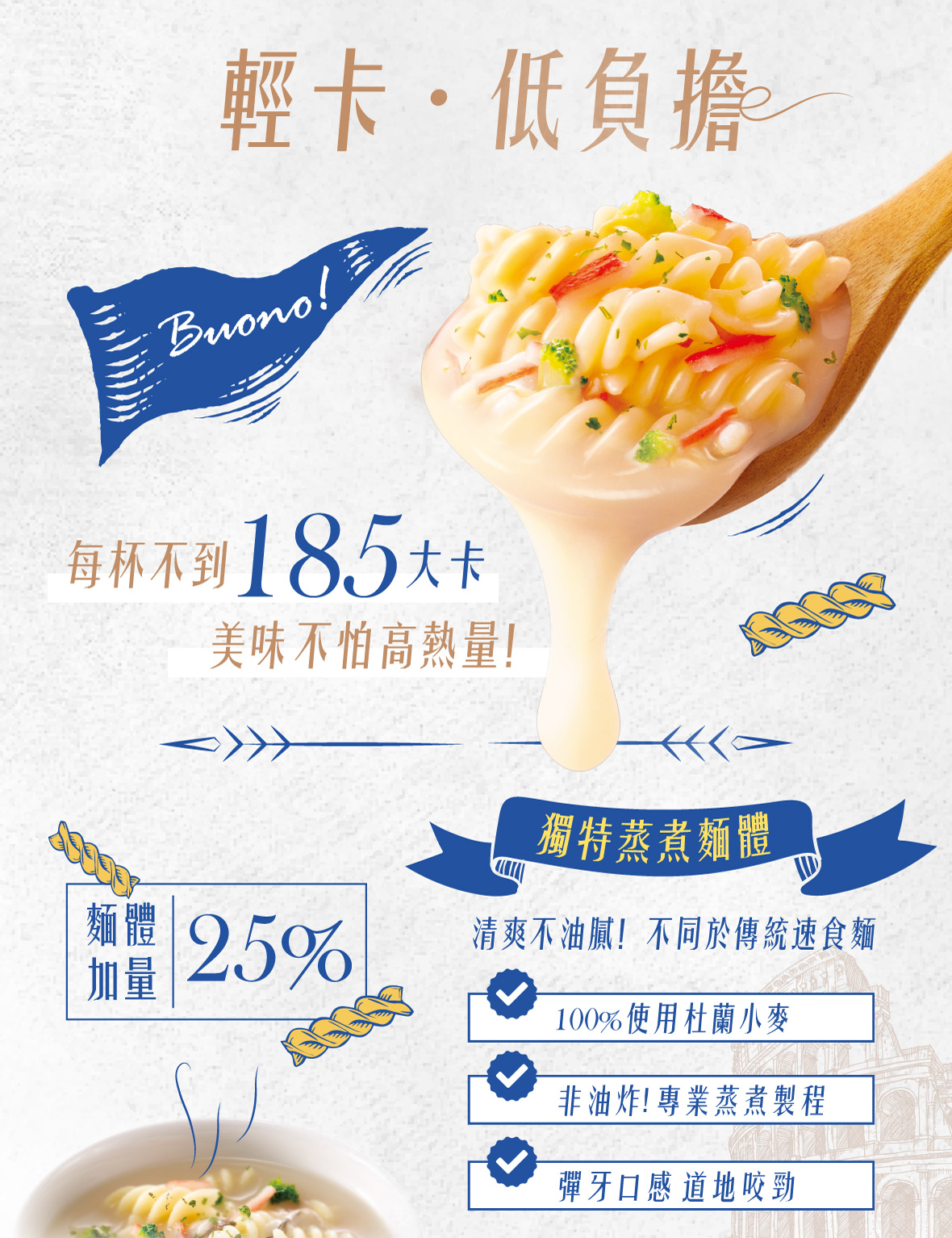 ⊿100%杜蘭小麥蒸煮而成的義大利螺旋麵